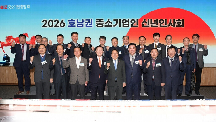 [광주=정찬남 기자] 강기정 광주광역시장(앞줄 왼 쪽부터 다섯 번째)이 22일 오후 김대중컨벤션센터에서 열린 호남권 중소기업인 신년인사회에 참석해 인사말을 한 후 참석자들과 함께 기념촬영을 하고 있다. /광주광역시 제공