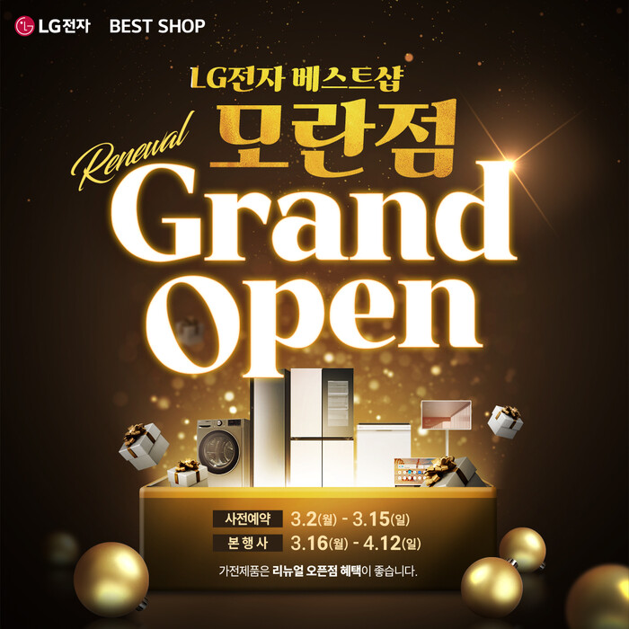 LG전자 베스트샵 모란점이 리뉴얼 그랜드 오픈을 앞두고 3월 2일부터 3월 15일까지 사전예약 행사를 먼저 진행한다. 이번 사전행사는 3월 16일부터 시작되는 본행사에 앞서, 혜택을 선점할 수 있는 기간으로 운영된다.