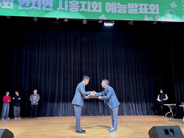 | ▲ 제4회 한지연 시흥지회 예능발표회 기념식에서 HR그룹 지덕형 상무이사(왼쪽)가 '국회의원(문정복) 표창상'을 받고 있다. / 사진=HR그룹(주) 미디어팀 제공 |