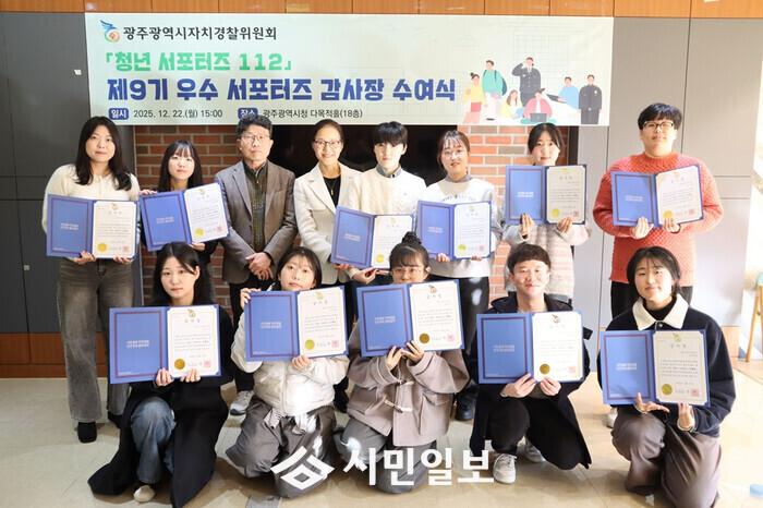 | ▲ 광주광역시 자치경찰위원회, 22일 시청 다목적홀에서 ‘제9기 청년 서포터즈112’ 우수 서포터즈에게 감사장 수여 후 기념촬영 / 광주광역시 제공 |