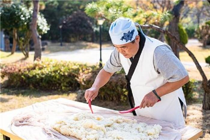 | ▲ 문화체육관광부 주관 한국관광공사가 시행한 2023년 관광두레 으뜸두레 선정 공모사업에서 ‘예비으뜸두레’로 선정된 영암군·읍 기찬랜드 내에 자리한 관광두레 주민사업체인 ‘우리술과 힐링’ 관계자가 술을 빚기 위해 마련한 갓 쪄낸 고두밥의 열기를 식히기 위해 펼치기 작업을 하고 있다. / 영암군 제공. |