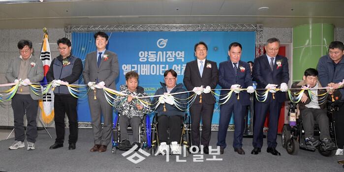 강기정 광주광역시장(오른 쪽부터 다섯 번째)이 9일 오전 양동시장역 대합실에서 열린 외부 엘리베이터 설치공사 착공식에 참석해 참석자들과 함께 착공 테이프 커팅을 하고 있다. /광주광역시 제공