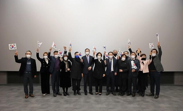 | ▲ 해남군이 3.1절을 맞아 해남 옥천면 영신리 출신인 독립운동가 지강 양한문 선생을 재조명하는 다큐영화 "아!꽃이여, 별이여" 시사회를 해남시네마에서 개최 했다. 이날 명현관 해남군수(좌측부터 6번)는 부인 임경자 여사를 비롯해 지강 양한묵 선생을 다룬 영화 감독, 관계자, 양한묵 선생의 일가 관계자, 서해근 해남군의원 등과 함께 3,1절 기념 퍼포먼스를 하고 있다. / 사진=해남군 제공 |