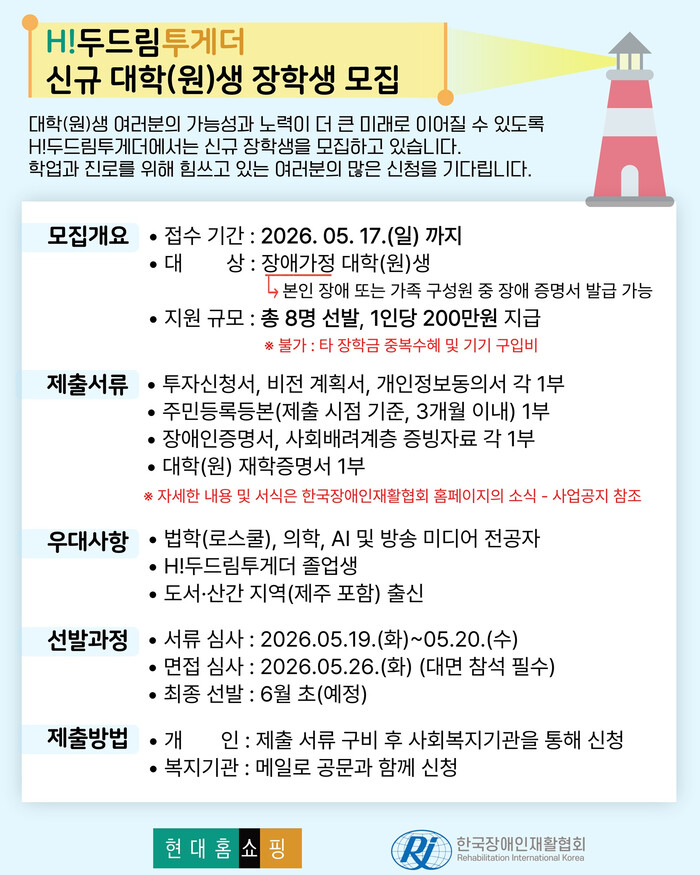 양 기관은 저소득 장애가정 청년을 대상으로 ‘H!두드림투게더 대학(원)생 장학생’을 선발한다고 밝혔다. 모집 인원은 총 8명이며, 선발된 장학생에게는 학업과 진로 개발에 활용할 수 있는 장학금이 200만 원 한도로 지원된다.