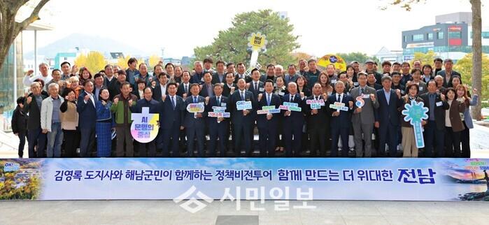 | ▲ 김영록 전남지사(사진 앞줄 가운데), 20일 해남군민 광장에서 명현관 해남군수, 이성옥 해남군의회 의장과 군의원, 유관기관장, 주민 등과 해남군민이 함께하는 정책비전 투어 기념촬영 / 해남군 제공 |