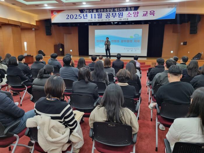 진주시는 28일 시청 2층 시민홀에서 공무원 150여 명이 참석한 가운데 남형기 전(前) 국무조정실 제2차장을 초청해 ‘공무원 소양교육’을 실시했다.