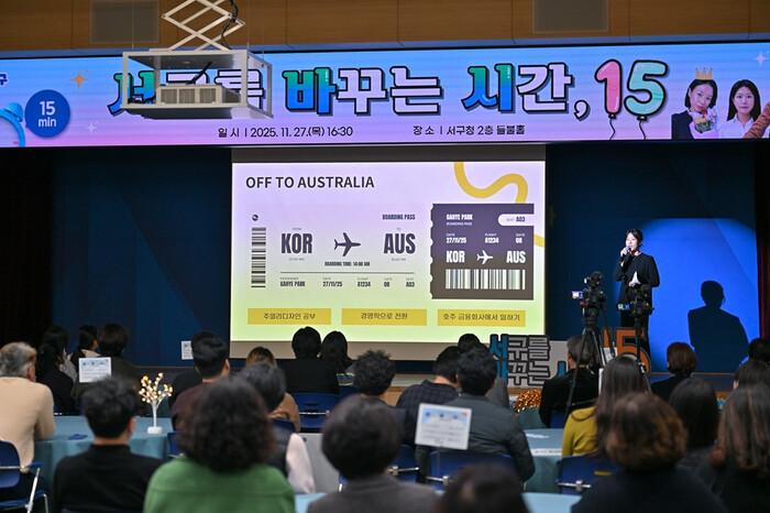 [광주=정찬남 기자] 광주 서구(구청장 김이강)는 27일 서구청 들불홀에서 ‘서바시15(서구를 바꾸는 시간 15분) 제7강’을 개최하고 나도 부모(엄마)가 처음이라, 선택의 끝에서 내가 만난 사람 등에 대해 15분 강의를 진행했다. 광주 서구 제공