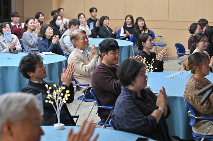 김이강 광주 서구청장이 27일 서구청 들불홀에서 열린 ‘서바시15(서구를 바꾸는 시간 15분) 제7강’에서 직원들과 강의를 듣고 있다. 광주 서구 제공