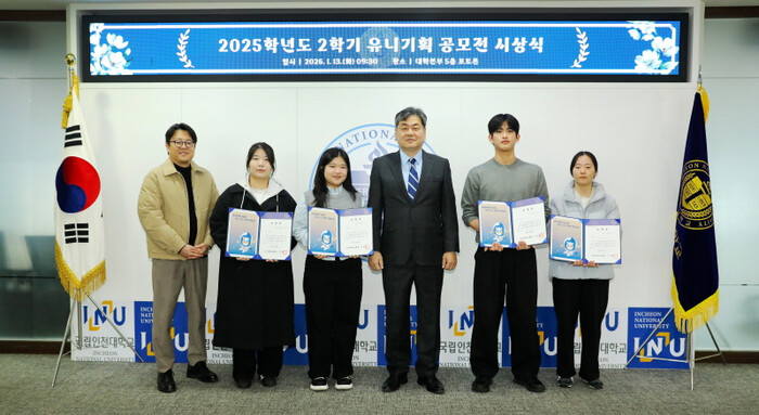 | ‘25-2학기 인천대학교 유니기획 공모전’ 시상식 참가자들이 기념촬영을 하고 있다. [사진=인천대] |
