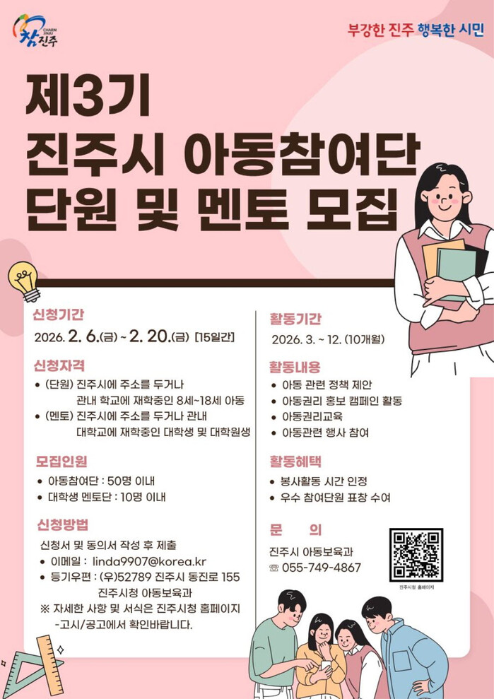 아동참여단은 아동의 권리 증진과 정책 참여를 목표로 하는 진주시의 대표적인 아동 참여 기구로, 2026년 3월부터 12월까지 ▲아동정책 제안 활동 ▲아동권리 교육 및 아동권리 캠페인 활동 참여 ▲아동관련 행사 참여 등 다양한 활동을 하게 된다.