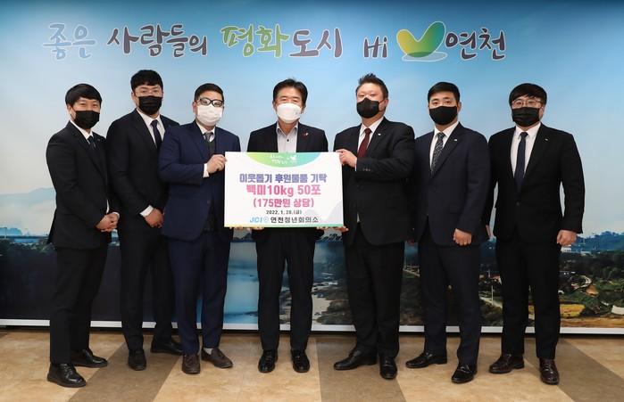 경기 연천청년회의소가 최근 연천군청을 방문, 관내 저소득층 다문화가정 및 한부모가정을 위해 백미 50포를 기탁했다. 사진은 백미 기탁 후 기념촬영을 하고 있는 관계자들의 모습.(사진제공=연천청년회의소)