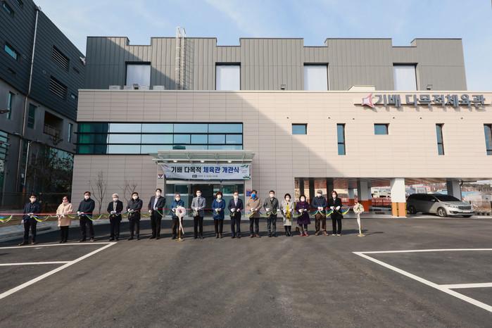 원유민 경기 화성시의회 의장과 김도근 의원이 최근 새로 문을 연 기배 다목적체육관(기안남로 62, 기배동)찾아 개관을 축하했다. 사진은 개관식에 참석한 의원들이 내빈들과 함께 리본 커팅식을 하고 있는 모습.(사진제공=화성시의회)