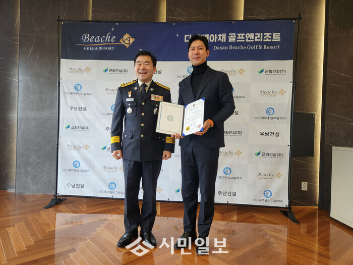 | ▲ 정용인 강진소방서장(왼 쪽), 재난 대응체계 기여 한 다산베아채 장보성 대표이사에게 유공자 표창 후 기념촬영 / 강진군소방서 제공 |