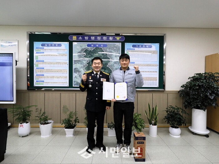 | ▲ 정용인 강진소방서장(왼 쪽), 재난 대응체계 기여 한 kt 강진지점 김성철 과장에게 유공자 표창 후 기념촬영 / 강진군소방서 제공 |
