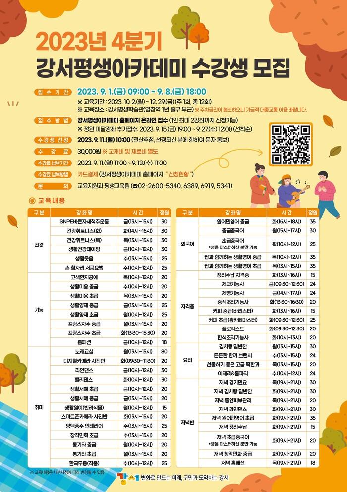 | ▲ 2023년 4분기 강서평생아카데미 수강생 모집 포스터. (사진=강서구청 제공) |
