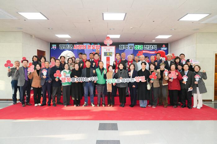 [양평=최광대 기자] 양평군(군수 전진선)은 지난 11일 양평군청 별관 4층 대회의실에서 ‘희망2026 나눔캠페인 사랑의 온도탑 제막 및 성금 전달식’을 개최했다고 밝혔다.