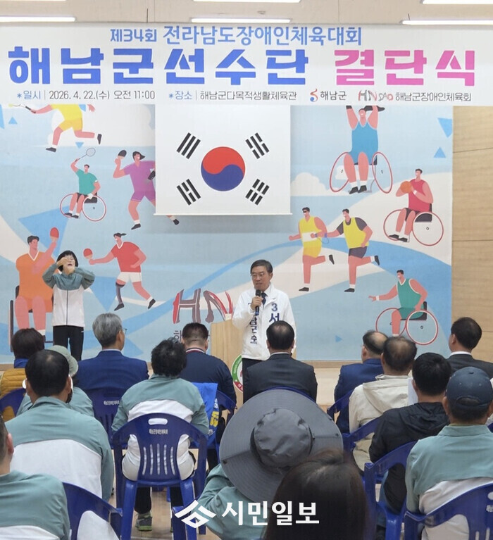 [해남=정찬남 기자] 서해근 조국혁신당 해남군수 후보가 22일 해남군 다목적생활체육관에서 열린 전라남도 장애인 체육대회에 출전하는 해남군 선수단 결단식에 참석해 선수단을 격려하며, 장애인 복지 인프라 확충을 위한 강력한 추진 의지를 밝혔다.