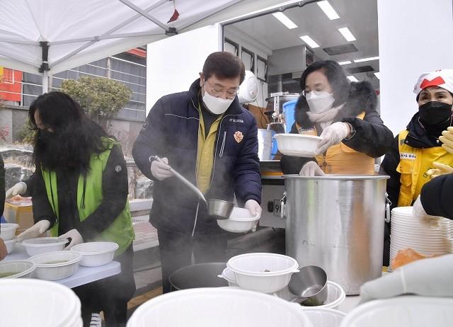 [광주=정찬남 기자] 이용섭 광주광역시장이 6일 오전 현대산업개발 아파트 신축공사 붕괴사고 현장 인근에서 소방 구조대원, 피해자 가족 등에게 전달하기 위해 음식을 준비 중인 대한적십자사, 광주시안전모니터봉사단을 격려한 뒤 봉사자들과 함께 배식을 돕고 있다./광주광역시 제공