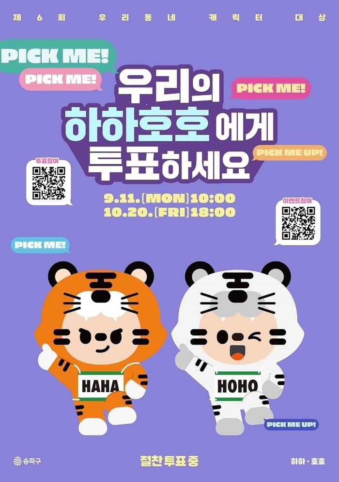 송파구 캐릭터 ‘하하, 호호’는 지난달 1차 전문가 심사를 통과해 총 30개의 본선 진출작 중 하나로 선정됐다. 최종 수상작은 10월 20일까지 진행되는 대국민 투표를 거쳐 총 10개의 캐릭터가 선정되며, 대상 수상 기관에는 상금 1,000만 원이 수여된다.