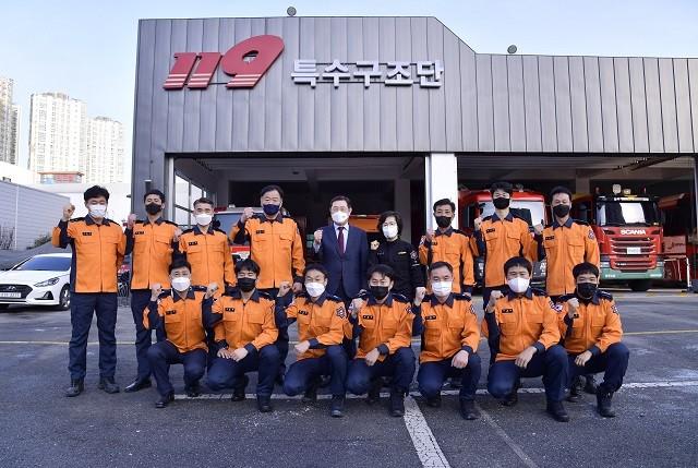 [광주=정찬남 기자] 이용섭 광주광역시장이 17일 오후 서부소방서를 방문해 현대산업개발 아파트 신축공사 붕괴사고 실종자 수색·구조 임무에 참여한 소방관들을 격려한 뒤 기념촬영을 하고 있다./광주광역시 제공