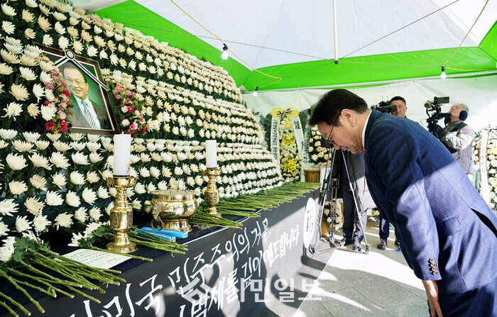 [광주=정찬남 기자] 강기정 광주광역시장이 28일 5·18민주광장에 마련된 이해찬 전 국무총리 광주 분향소를 찾아 헌화·참배하고 있다./광주광역시 제공