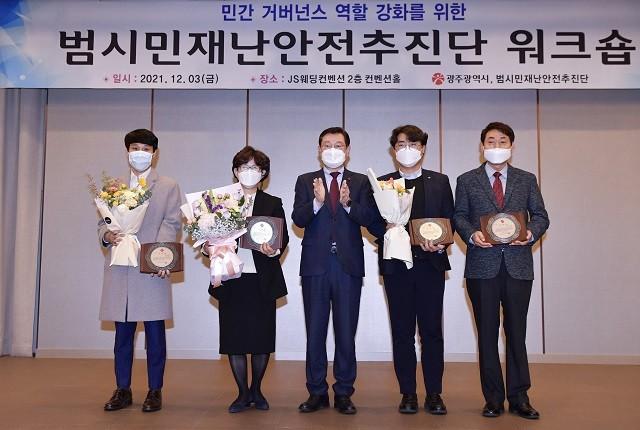 [광주=정찬남 기자] 이용섭 광주광역시장이 3일 오후 서구 JS웨딩컨벤션에서 열린 '범시민재난안전추진단 워크숍'에 참석해 유공자 표창을 수여한 뒤 기념촬영을 하고 있다. / 광주광역시 제공