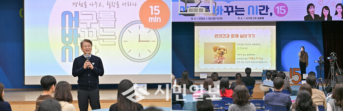 [광주=정찬남 기자] 김이강 광주광역시 서구청장(왼 쪽)이 30일 서구청 들불홀에서 ‘2026 서바시15(서구를 바꾸는 시간 15분) 제1강’에 참석해 인사말을 하고 있다. 서구청은 이날 나의 화끈한 취미생활, 반려견과 함께 살아가기 등에 대해서도 15분 강의를 진행했다./ 광주 서구 제공