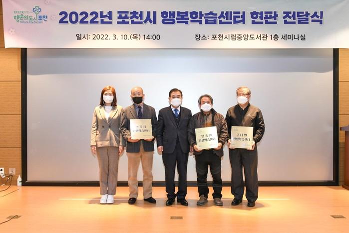 경기 포천시가 지난 10일 포천시립중앙도서관에서 '2022년 포천시 행복학습센터'로 선정된 3개 주민자치센터를 대상으로 행복학습센터 현판 전달식을 개최했다. 올해는 소흘읍, 군내면, 영중면 주민자치센터가 각각 해당 읍·면·동의 행복학습센터로 선정됐다. 사진은 이날 행사에서 박윤국 시장(가운데)이 현판을 전달하고 관계자들과 기념촬영을 하는 모습. (사진제공=포천시청)