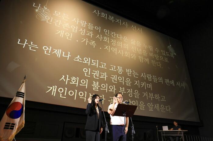 | ▲ 제24회 사회복지의 날 기념행사에서 사회복지사 대표(왼쪽)와 공무원 대표(오른쪽)이 사회복지사 선서를 하고 있다.(사진=구로구청 제공) |