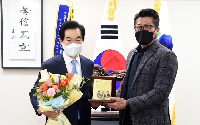 안병용 경기 의정부시장은 지난 10일 의정부시배구협회로부터 의정부시 체육 발전과 배구 종목 활성화 기여에 대한 감사의 마음을 담은 감사패를 받았다. 사진은 안 시장(왼쪽)과 홍성칠 의정부시배구협회장이 기념촬영을 하는 모습.(사진제공=의정부시청)