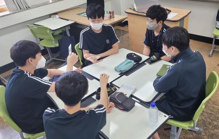 | ▲ 지난 6일 운영된 숭곡중학교 '찾아가는 공정무역 교실'에서 학생들이 수업에 참여하고 있다. (사진=성북구청 제공) |