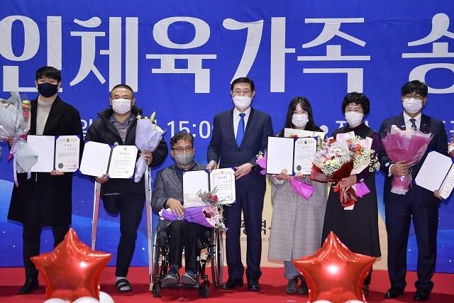 [광주=정찬남 기자] 이용섭 광주광역시장(사진/ 가운데)이 13일 서구 광주장애인국민체육센터에서 열린 '2021 광주광역시 장애인체육가족 송년행사'에 참석해 유공자 표창을 수여 한 뒤 기념촬영을 하고 있다.