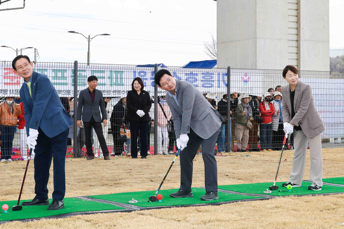 | ▲ 이상일 용인특례시장(가운데)이 31일 기흥호수에서 열린 파크골프장 준공식에서 시타를 하고 있다. |