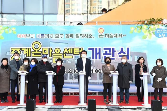 서울 노원구는 지난 10일 중개온마을센터(한글비석로 371) 개관식을 진행했다. 중계온마을센터는 지하 1층~지상 4층 총 면적 2989㎡ 규모로 작은도서관·마을공동체지원센터 등을 조성했다. 사진은 오승록 노원구청장(오른쪽에서 다섯 번째)이 개관식에 참여한 모습.(사진제공=노원구청)