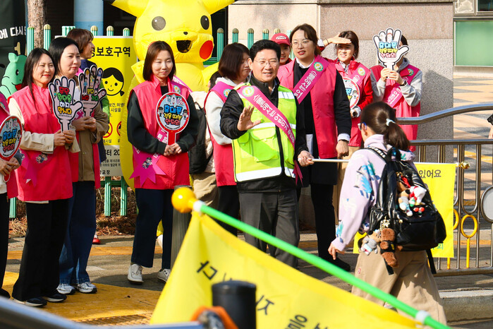 [용인=오왕석 기자] 이상일 용인특례시장은 31일 아침 기흥구 흥덕초등학교를 방문해 학생들의 안전한 통학을 위한 교통지도 봉사활동에 참여했다.