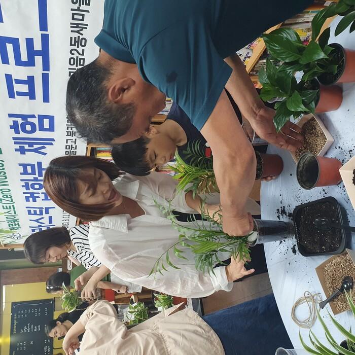 이날 행사는 어린이부터 노인까지 다양한 연령층의 주민 70명이 참여한 가운데 북카페에서 사용하고 버려지는 일회용 플라스틱 음료 컵을 활용해 반려식물 화분을 만들었다.