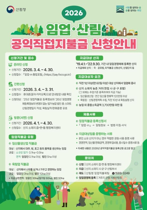 임업직불금 신청은 오는 3월 1일부터 4월 30일까지 ‘임업-in 통합포털’에서 온라인으로 신청이 가능하며 4월 1일부터 4월 30일까지는 가장 큰 면적을 가진 산지소재지 읍.면사무소에 방문하여 신청하면 된다.