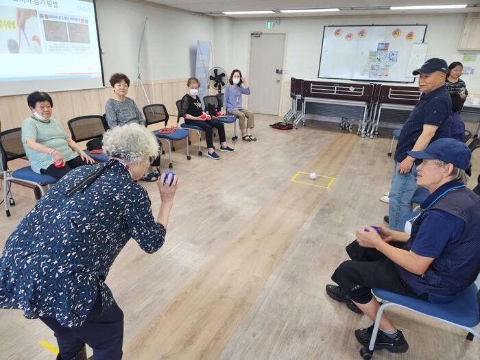 | ▲ 찾아가는 시니어 운동교실 보치아운동 프로그램에 참여하고 있는 노인들의 모습. (사진=강서구청 제공) |