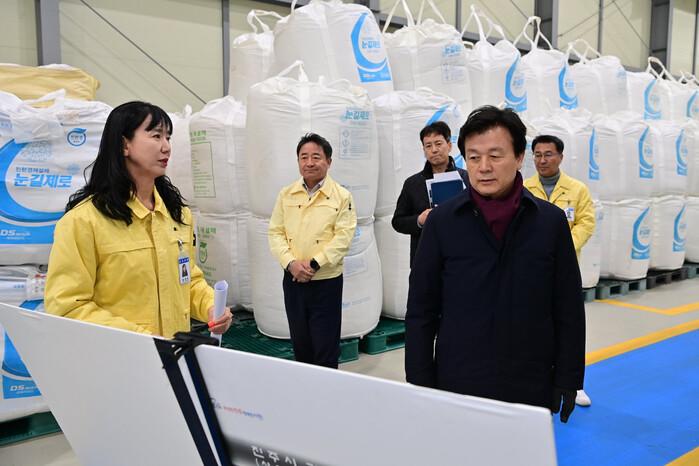 ‘도로관리 자재창고’는 겨울철 도로결빙 및 강설에 대비할 수 있도록 친환경 제설제와 염화칼슘 323톤(38톤 읍면동 비축), 모래 등 주요 제설자재를 비롯해 제설차량 5대, 제설장비 등이 구비돼 있다. 이날 조규일시장 등 시 관계자들은 전진기지의 장비·자재의 배치현황과 장비 가동상태, 관리상태 등을 꼼꼼히 확인했다.