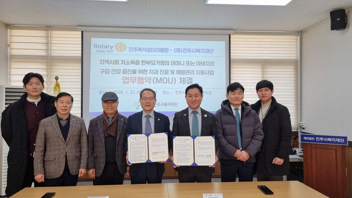진주시복지재단(이사장 이성갑)은 21일 진주시복지재단에서 국제로타리 3590지구 진주촉석로타리클럽(회장 최영진)과 저소득 한부모 가정의 구강 건강 증진을 위한 업무협약(MOU)을 체결했다.
