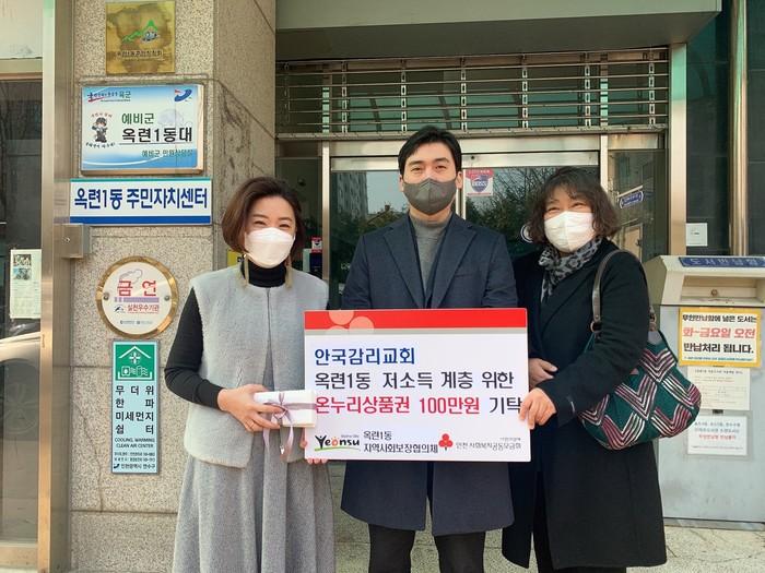 인천 연수구는 최근 지역내 저소득층을 위해 배우 유진으로부터 시리얼(350g) 1290팩을, 옥련동 안국감리교회으로부터 상품권 100만원을, 선학동 연수치과 의원으로부터 장학금 40만원 등 기부금과 물품을 전달받았다. 사진은 전달식에서 안국감리교회 관계자들이 기념촬영을 하는 모습.(사진제공=연수구청)
