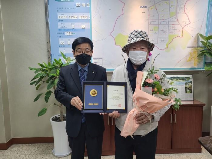 경기 광주시 광남2동은 지난 30일 경기도 선행도민 표창을 장관선 상림수목원 대표에게 전수했다. 장 대표는 상림수목원을 운영하며 시민에게 휴식공간을 제공하는 등 코로나19 장기화로 침체에 빠진 주민을 위로했으며, 1200만원의 이웃사랑 성금을 기탁해 타의 모범이 됐다. 사진은 전수식에서 장 대표와 이상오 동장이 기념촬영을 하는 모습.(사진제공=광주시청)