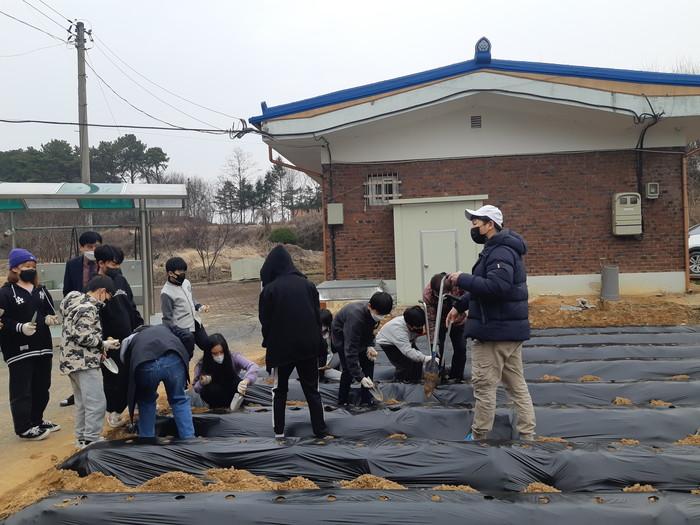 경기 여주시 송촌초등학교가 최근 전교생이 함께 사랑의 텃밭가꾸기 활동으로 감자를 심었다. 사진은 이날 학생들이 씨감자를 심고 있는 모습. (사진제공=여주시청)