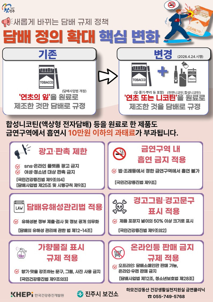 진주시 관계자는 “담배사업법 개정안의 시행에 따라 5월 15일까지 담배 소매점과 금연 구역의 지도 점검을 강화할 계획”이라며 “간접흡연의 피해를 최소화할 수 있도록 금연 환경을 지속적으로 개선해 나가겠다”라고 밝혔다.
