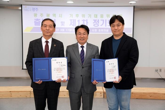 | ▲ 강기정 광주광역시장이 17일 오후 시청 중회의실에서 열린 '기후위기대응위원회 출범식'에 참석해 최도성 광주지속가능발전협의회 상임회장과 황태연 조선대학교 교수에게 각각 위원장과 부위원장 위촉장을 수여한 후 기념촬영을 하고 있다./광주광역시 제공 |