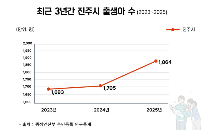 지난 5일 행정안전부의 주민등록 인구통계 발표에 따르면 진주시의 주민등록 출생아 수는 2023년 1693명으로 저점을 찍은 후, 2024년 1705명, 2025년 1864명으로 뚜렷한 증가세를 보였다.