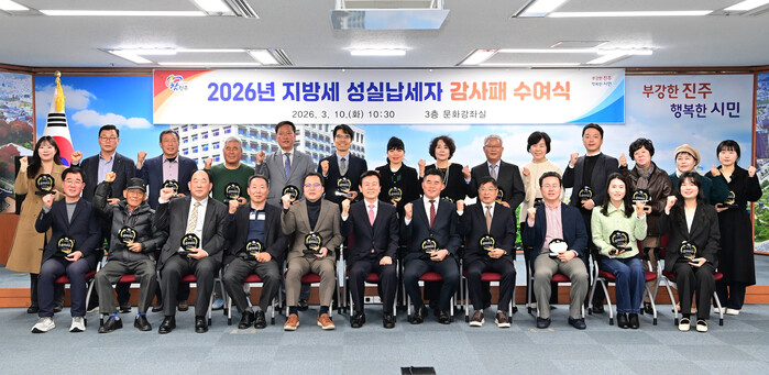 진주시는 10일 시청 문화강좌실에서 지방세 납부에 대한 시민의식을 높이고 건전한 납세문화 조성을 위한 ‘2026 지방세 성실납세자 감사패 수여식’을 개최했다.