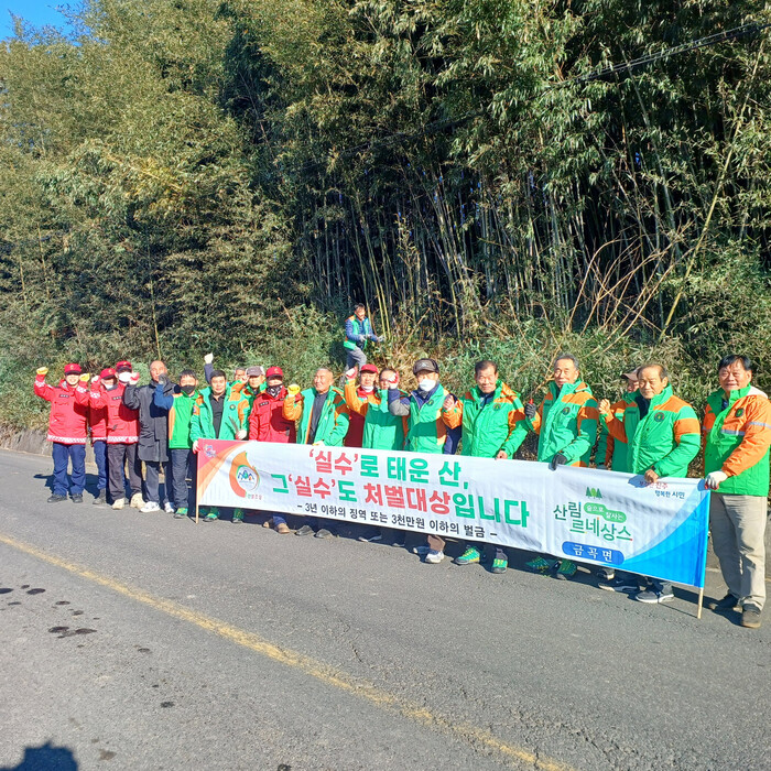 진주시 금곡면 자율방재단은 9일 관내 정자리 일원에서 도로변 차량 통행에 불편을 주는 재해 위험목을 제거하고, 동시에 산불 예방 캠페인을 실시했다.