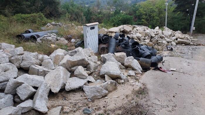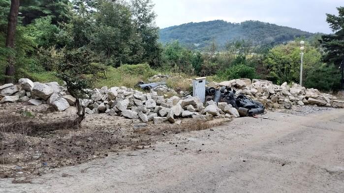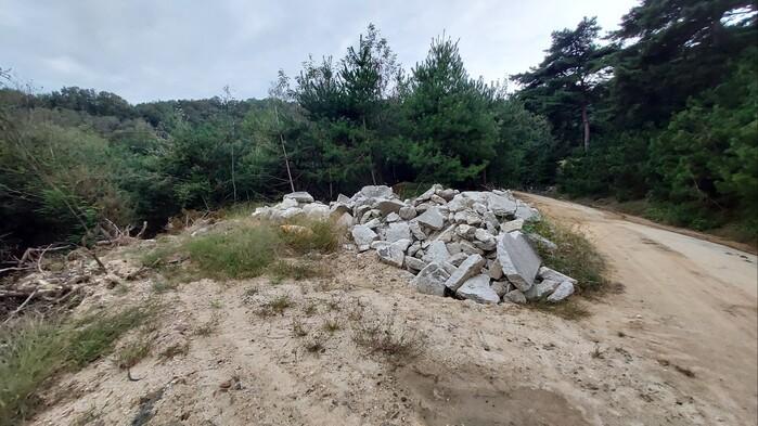 영남유교문화진흥원 인근 경북 구미시 선산읍 독동리 산 56-24외 2필지에 소재한 임야의 야산에는 수개월째 버려져 방치된 수십톤의 폐콘크리트가 있다.