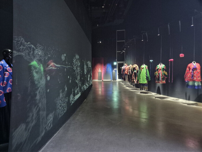 관람의 시작점인 ‘실크 아트’ 구역에서는 이진희 의상감독의 작품 세계를 만날 수 있다. 이곳에서는 특별전 「오방 – The Woven Cosmos」가 전시되고 있으며, 한국 전통 색채인 오방색(청·적·황·백·흑)의 상징성과 실크의 물성을 결합한 작품들이 소개된다.